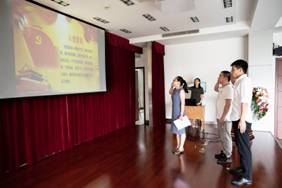 頒獎(jiǎng)結(jié)束進(jìn)入黨員重溫入黨誓詞環(huán)節(jié),朱書(shū)記在臺(tái)前領(lǐng)誓,新黨員張哨駿、王宇上臺(tái)宣誓,全體黨員起立,面向黨旗重溫入黨誓詞。